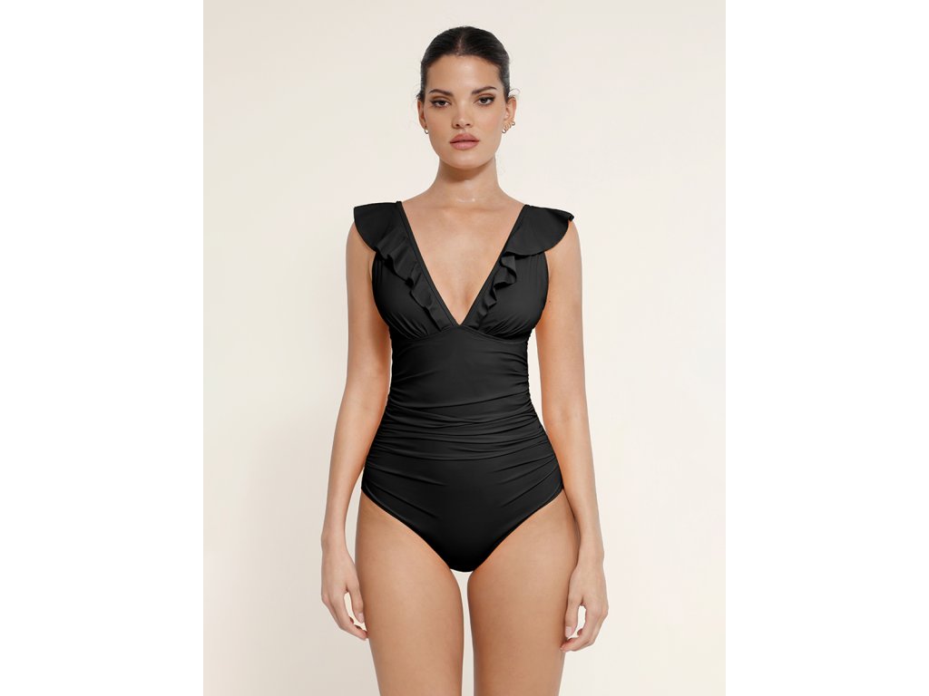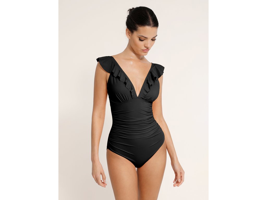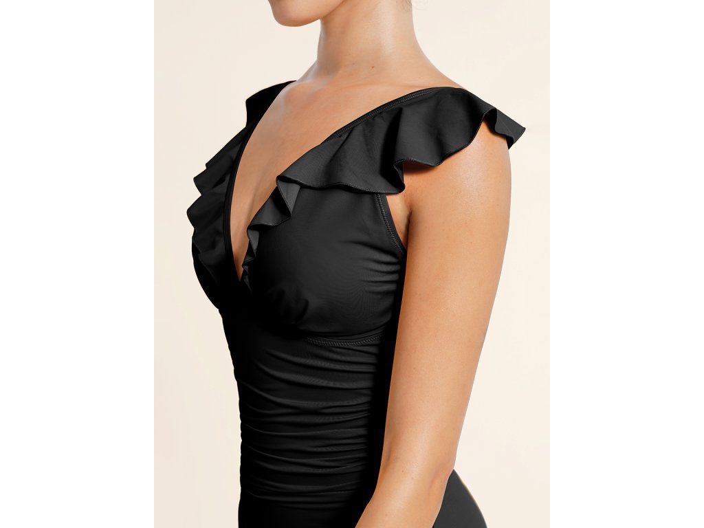 Tvarující jednodílné plavky s volánky, ČERNÉ