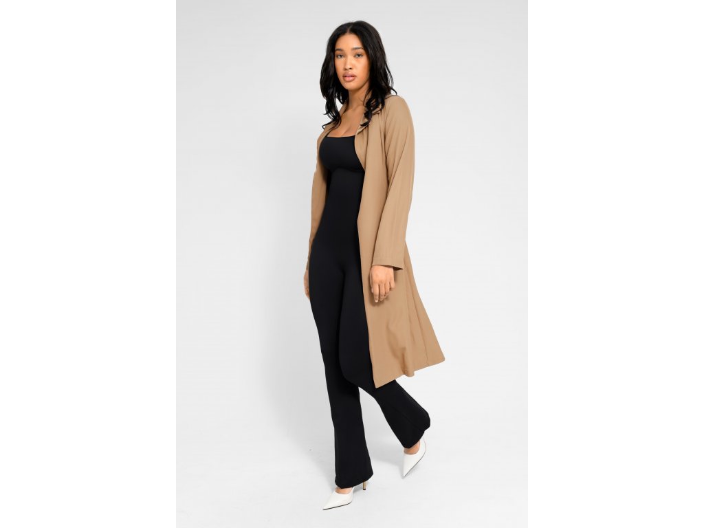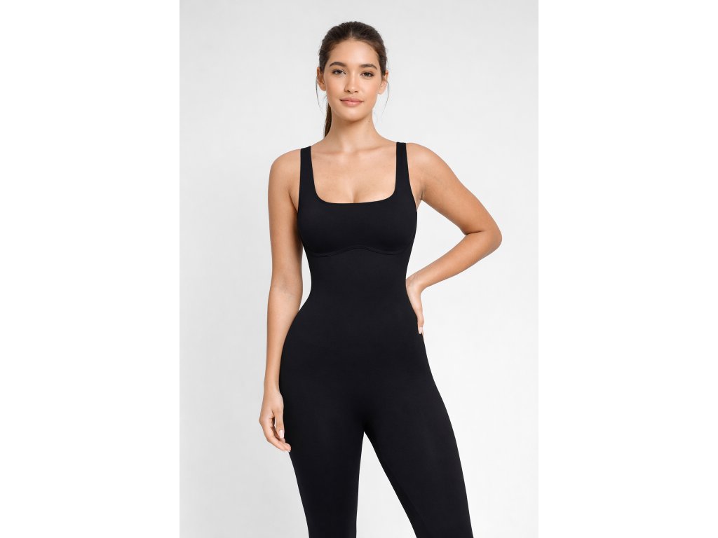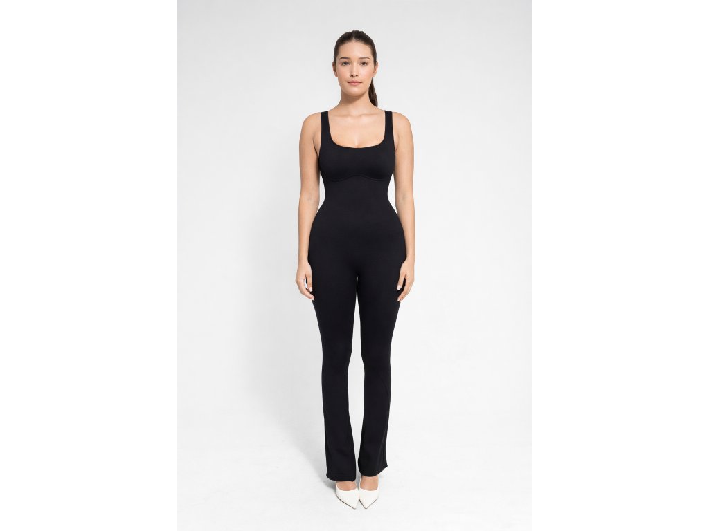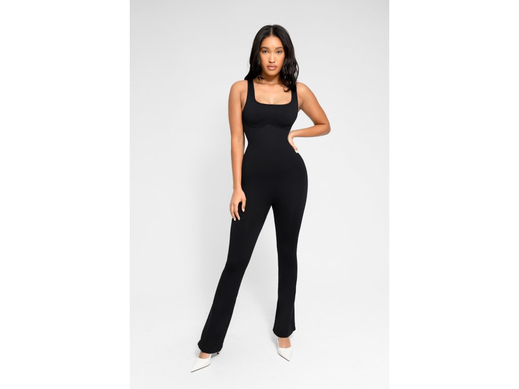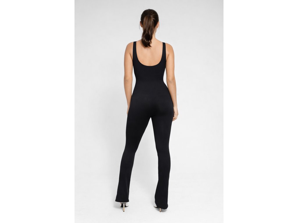 Zpevněná tkanina v oblasti břicha a pasu působí jako tajná zbraň – jemně formuje vaši siluetu do ideálních přesýpacích hodin, aniž by omezovala pohyb. Samotné zvonové kalhoty dodávají overálu trendy vzhled a snadno je zkombinujete s různými doplňky – ať už chcete casual styl, nebo elegantní outfit.