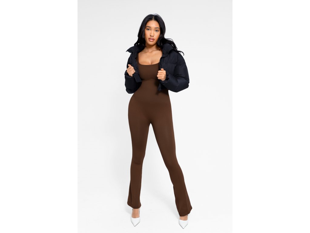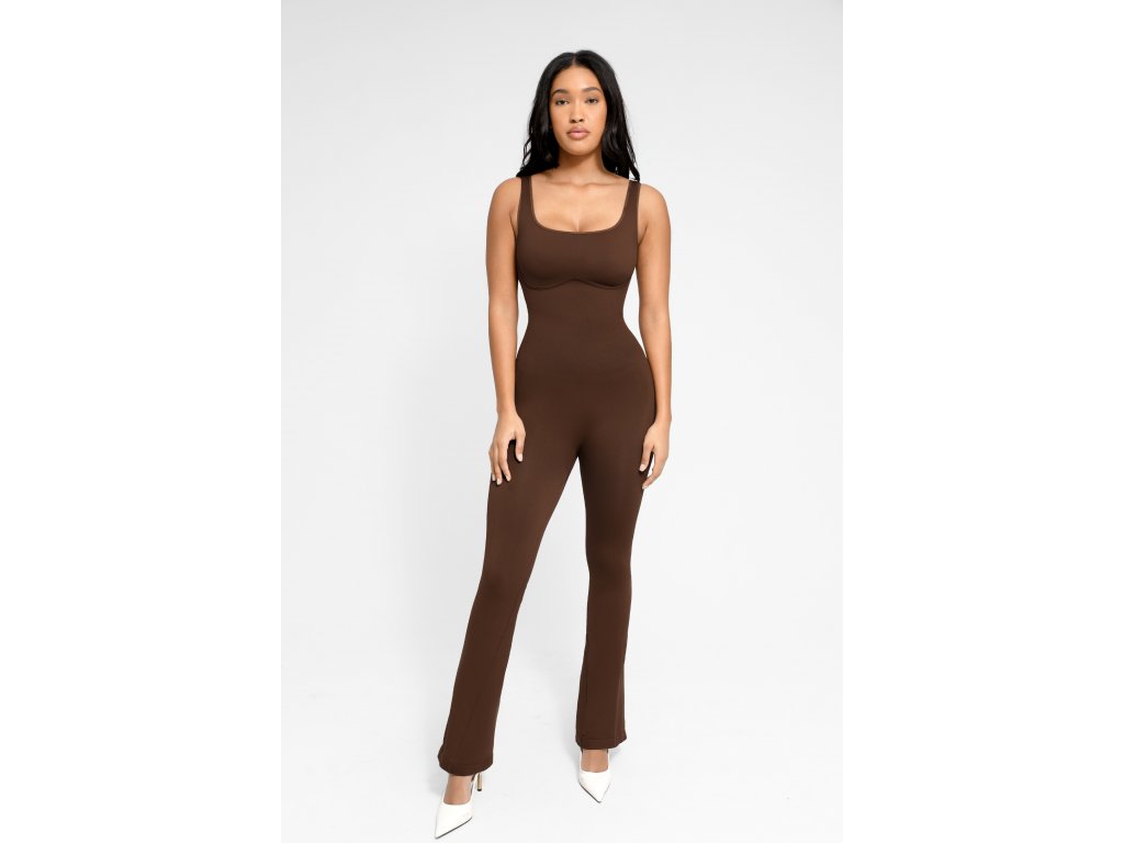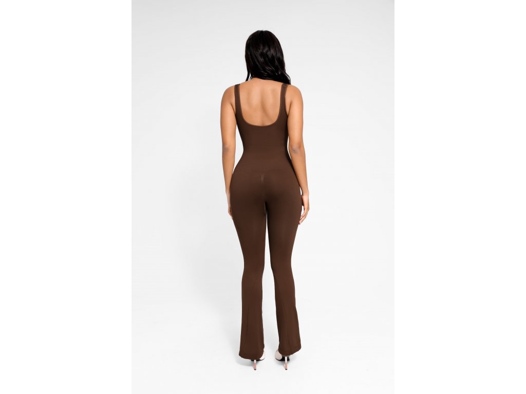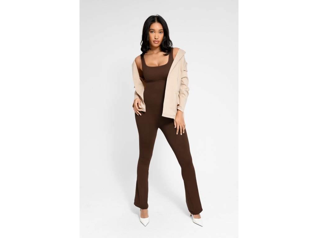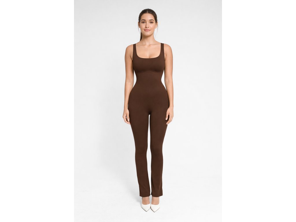 Zpevněná tkanina v oblasti břicha a pasu působí jako tajná zbraň – jemně formuje vaši siluetu do ideálních přesýpacích hodin, aniž by omezovala pohyb. Samotné zvonové kalhoty dodávají overálu trendy vzhled a snadno je zkombinujete s různými doplňky – ať už chcete casual styl, nebo elegantní outfit.